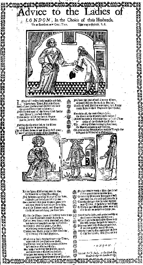 The ballad "Advice to the Ladies" was printed in London between 1686 and 1688, during R[ichard] P[ohock]'s term as Surveyor of the Press (1685-88). The broadside is by Thomas d'Urfey, but was published anonymously. For a response in the same vein, see the companion piece "Advice to Young Gentlemen." A second response is found in "As I was Rambling near Temple-Bar." For subsequent versions, see ESTC T68171 / N16946 / N13406 / N7150 (possibly by Defoe) and the response ESTC N25328;  cf. also ESTC N65806 (attributed to Swift).