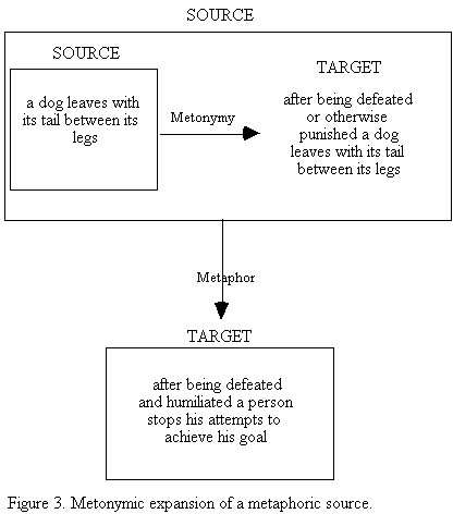 Now consider the other interactional possibility, i.e. one in which a whole metaphor is constructed on the basis of a metonymy, as in the sentence He left with his tail between his legs. Here there are two stages in the development of the explicature: one is metonymic and the other is metaphoric. The metaphor suggests that a person has been defeated and humiliated. This implication is based on the stereotypical representation of a dog leaving with its tail between its legs after being defeated or otherwise punished. The following diagram tries to capture the development of the explicature: